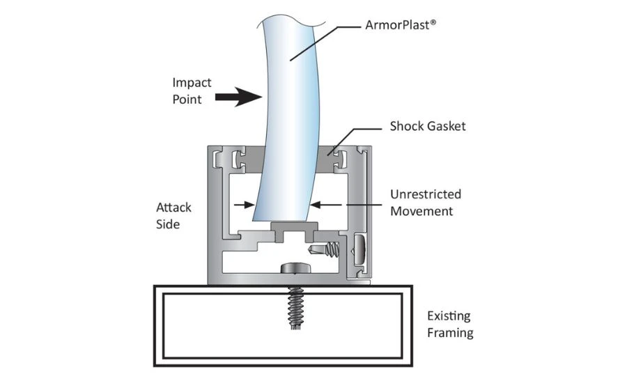 This security framing uses a sophisticated system of shock-absorbing gaskets to disperse the force of impacts on the surface of the glazing. When someone or something impacts any part of the security glazing, the shock gaskets allow unrestricted movement at the edges of the infill, dispersing the shock waves from the impact site.